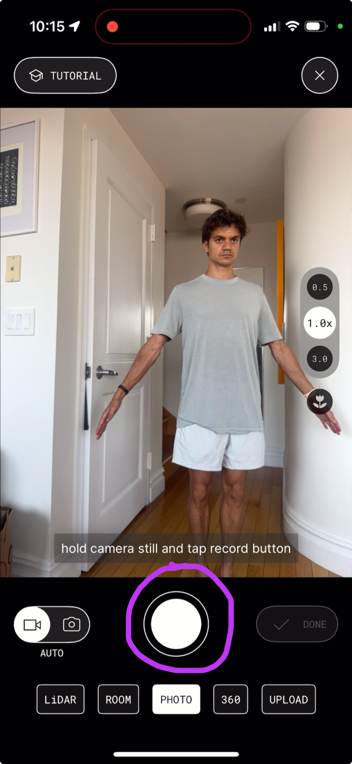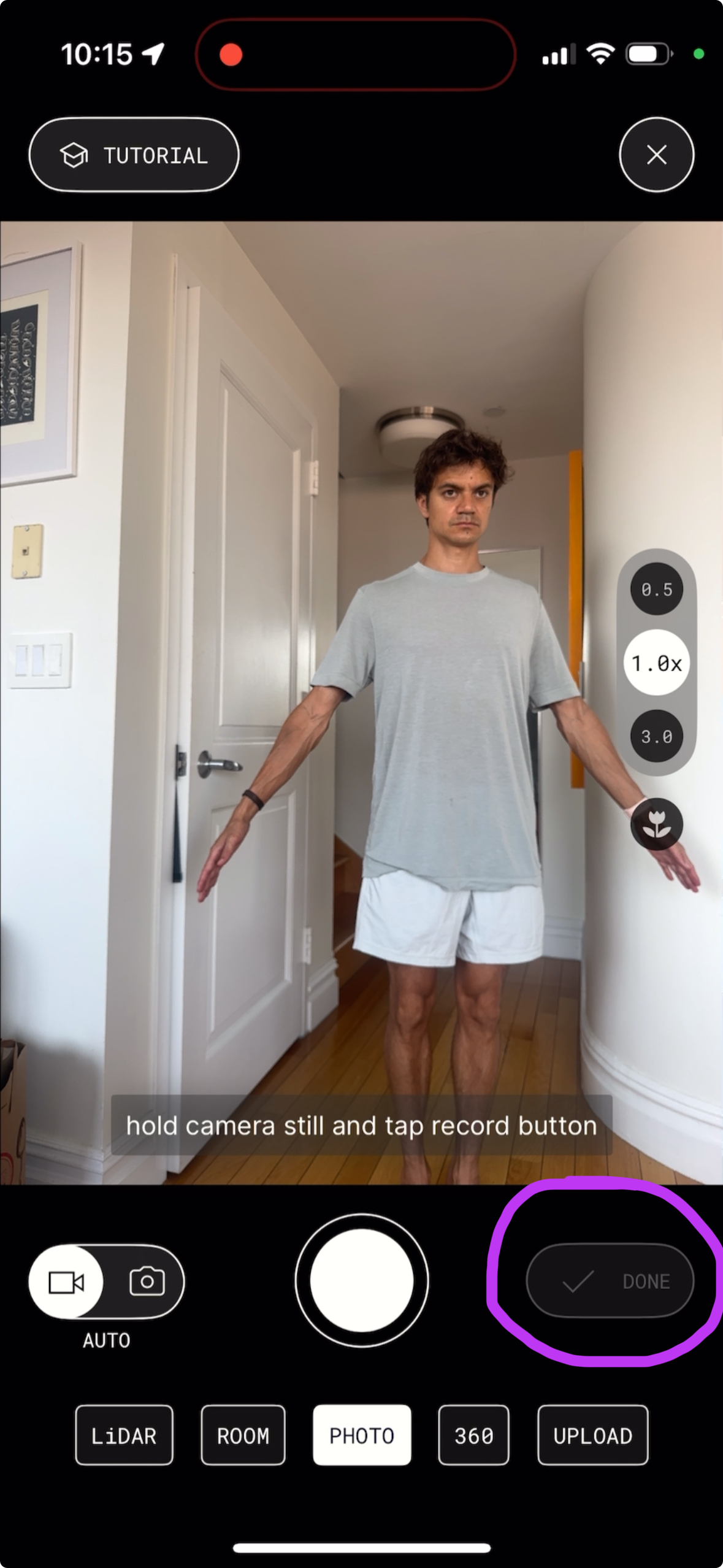 The slower you walk, the more images Polycam will be able to capture, making your scan sharper. You should take at least a full minute to walk around them. Your subject must stay completely still the whole time!